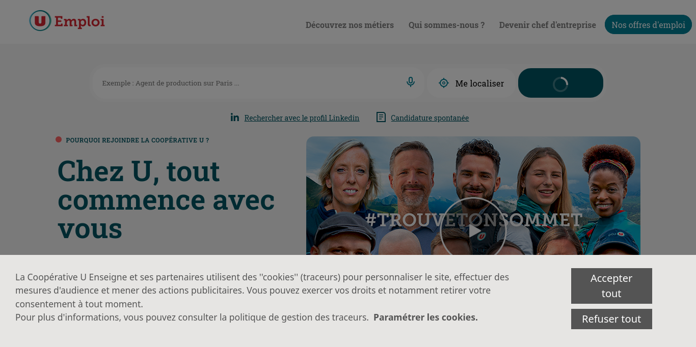 Chez U, nous sommes toujours en mouvement et vous ne risquez pas de vous ennuyer. Vous vivrez l’expérience U où votre esprit d'initiative, votre sens des responsabilités pourront s'exprimer au service d'une efficacité collective. Vous aurez la liberté de choisir, d’évoluer, voire d'entreprendre car chez U, tout commence avec Vous !