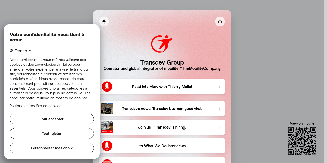 En tant qu’opérateur et intégrateur de mobilités, nous permettons à chacun de se déplacer chaque jour grâce à des solutions sûres, efficaces et innovantes au service du bien commun. Avec une implantation internationale dans 19 pays, nous transportons au quotidien en moyenne 12,8 millions de passagers, grâce à 16 différents modes de transport respectueux de l’environnement pour une mobilité durable et inclusive. Avec plus de 105 000 femmes et hommes au service des clients, de la mobilité des passagers, Transdev est leader mondial du transpor. Nous conseillons et accompagnons dans une collaboration durable les collectivités territoriales et les entreprises. Nous aidons à renforcer la cohésion sociale en offrant une mobilité accessible à tous. Transdev est codétenu par le Groupe RETHMANN à 66% et par la Caisse des Dépôts à 34%. En 2024, le Groupe a réalisé un chiffre d’affaires de 10,05 milliards d’euros. Le développement des compétences de nos équipes est une priorité par la formation continue, la mobilité professionnelle et le partage.