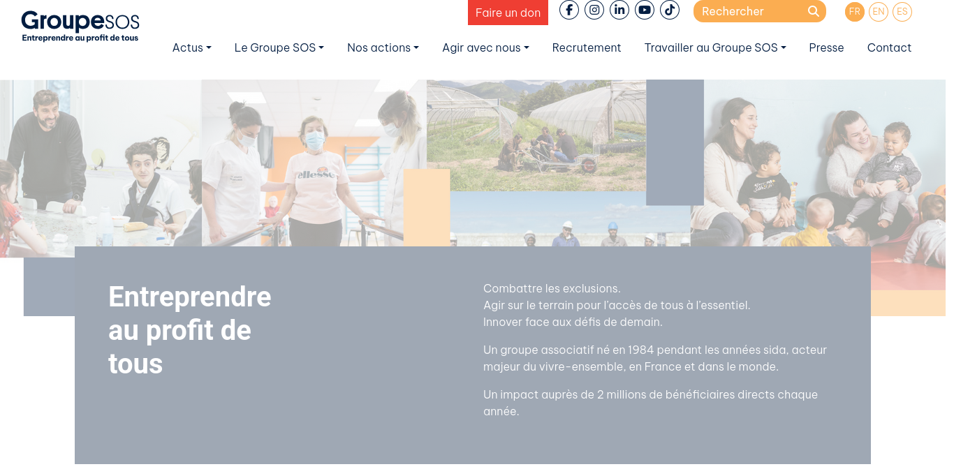 Le Groupe SOS est une organisation à but non lucratif, engagée en faveur du vivre-ensemble. Il développe et unit des associations et entreprises sociales, reliées par leur engagement social et environnemental.
