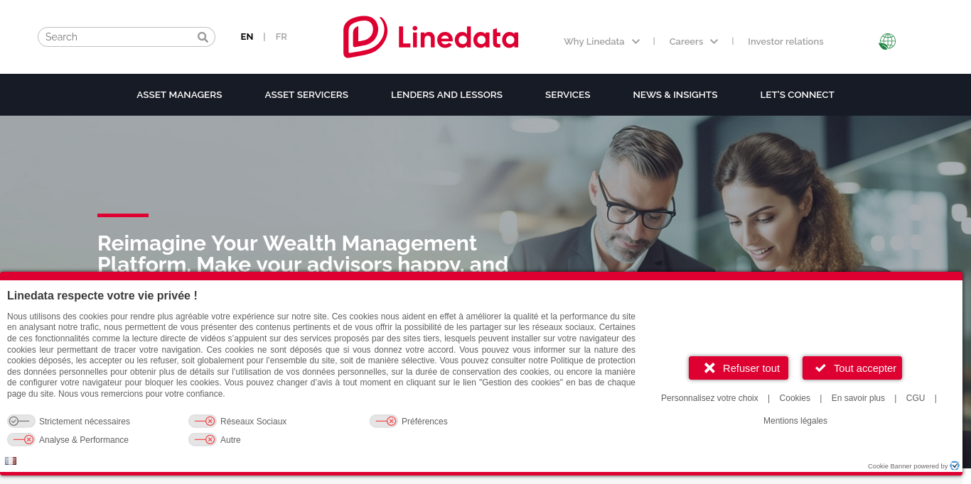 With 25+ years of experience and 700 clients in 50 countries, Linedata’s 1100 employees in 20+ offices provide global humanized technology solutions and services for the asset management and credit industries, helping its clients evolve and operate at the highest levels.