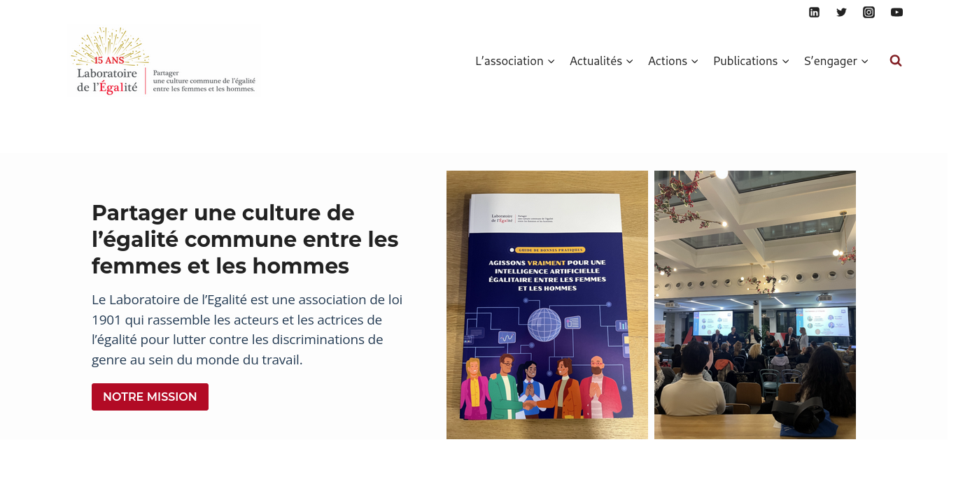 Le Laboratoire de l'Egalité est une association créée en 2010 qui oeuvre pour l'égalité entre les femmes et les hommes dans les secteurs de la vie professionnelle, économique, citoyenne, sociale et familiale. Il a prouvé qu'il était une force de rassemblement, d'interpellation des personnalités publiques et privées, et de sensibilisation de l'opinion publique.