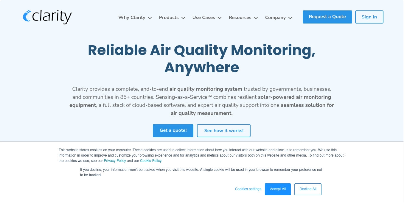 Resilient solar-powered air monitoring equipment, a full stack of cloud-based software, and expert air quality support combined into one seamless solution for air quality measurement. Clarity provides a complete, end-to-end air quality monitoring system trusted by governments, businesses, and communities in 85+ countries. Find out why!