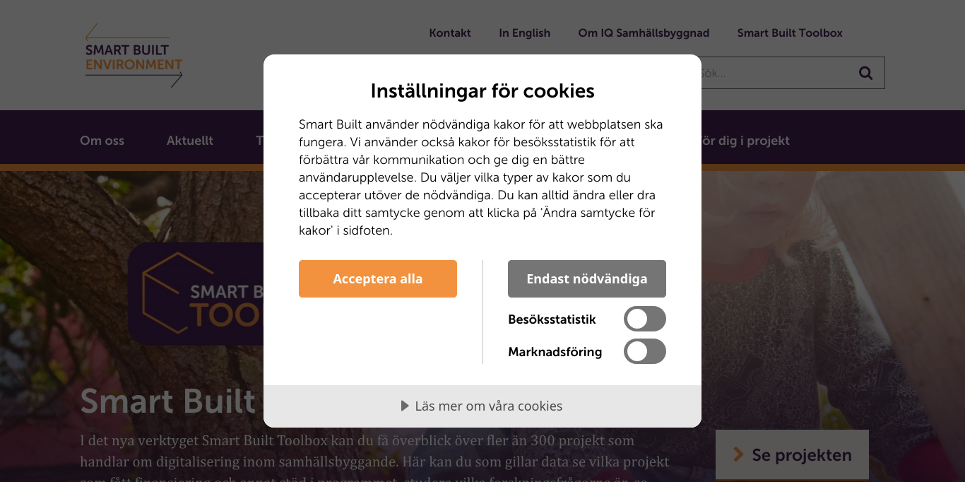 Smart Built Environment är ett strategiskt innovationsprogram för hur samhällsbyggnadssektorn kan bidra till Sveriges resa mot att bli ett globalt föregångsland som realiserar de nya möjligheter som digitaliseringen för med sig. Programmet innebär en unik satsning för att ta fram mer hållbara och integrerade sätt att bygga.