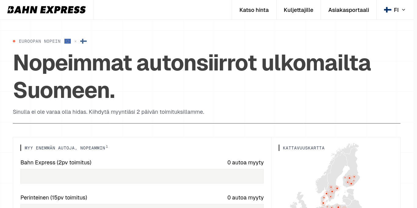 Nopea ajoneuvokuljetus Euroopassa. 2-5 päivän toimitus, täysin vakuutettu, kiinteä hinnoittelu. Kotimaassa ja kansainvälisesti.
